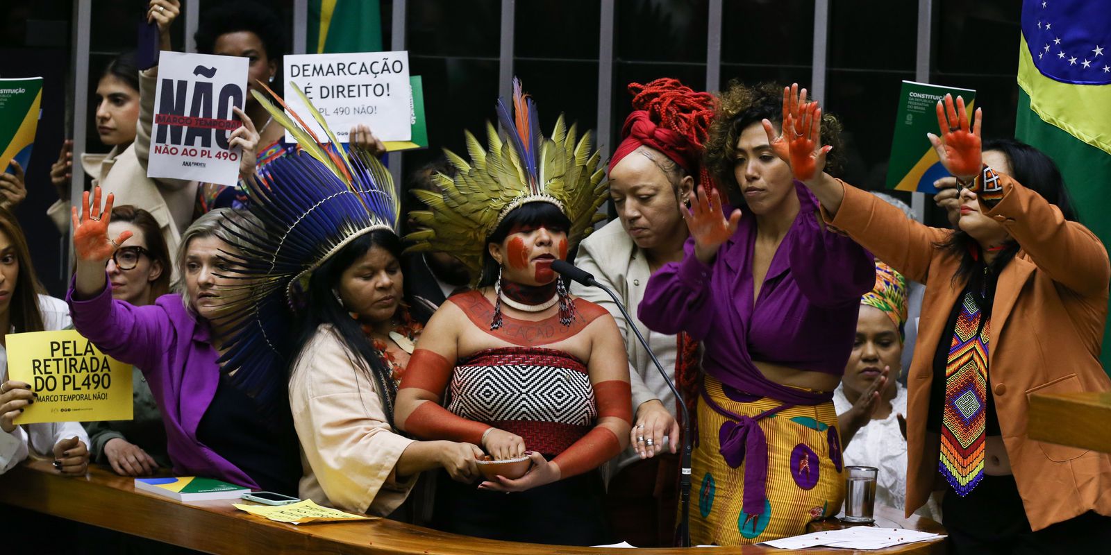 Segundo a denúncia, as deputadas quebraram o decoro parlamentar durante a votação do projeto do marco temporal de terras indígenas no plenário da Câmara. “Assassinos! Assassinos do nosso povo indígena!”, gritaram as deputadas ao microfone.