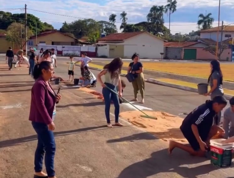 A paroquia de Hidrolândia reúne fieis, moradores e voluntários e vestem as ruas da cidade com cor, fé e tradição com a confecção dos tapetes de Corpus Christi, uma manifestação artística que expressa a devoção de Hidrolândia e emociona a quem passa.