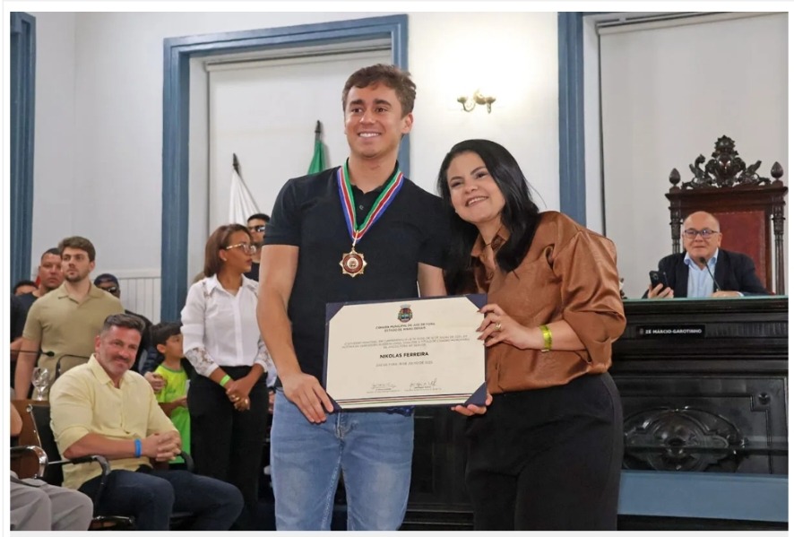 (Tribuna de Minas)- O deputado federal Nikolas Ferreira (PL), mais votado do país nas eleições de 2022, esteve em Juiz de Fora nesta quinta-feira (18) para receber o título de Cidadão Honorário concedido pela Câmara Municipal. A honraria foi proposta pela vereadora Roberta Lopes (PL) em reconhecimento ao “trabalho em defesa da família, da liberdade e da fé cristã”. Durante a sessão solene, o parlamentar também recebeu a medalha de mérito legislativo.