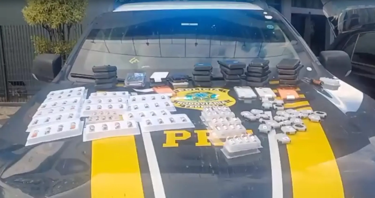 Na checagem, foram encontradas 104 ampolas de um remédio de uso controlado — prescrito originalmente para o tratamento de diabetes, mas amplamente usado de forma irregular como “caneta emagrecedora” — além de 69 celulares, 24 smartwatches, cosméticos, bebidas e outros eletrônicos. Parte do material estava escondida em compartimentos secretos no painel do automóvel.