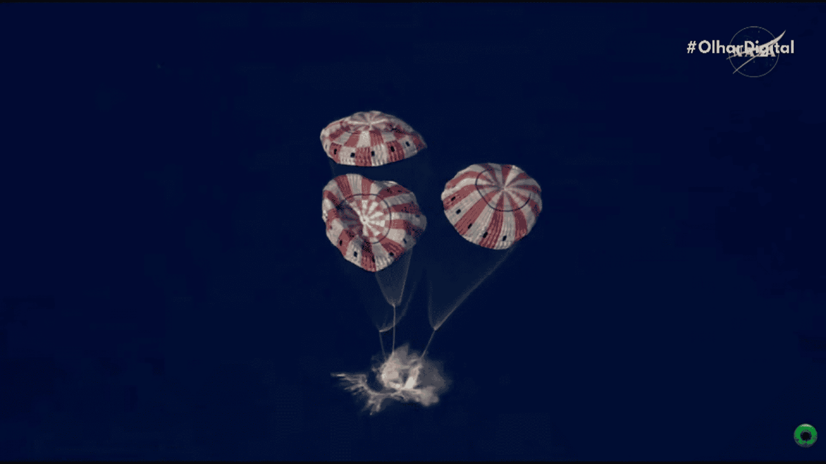 A Orion desceu suspensa a cerca de 81 metros abaixo desse conjunto, desacelerando para menos de 32 km/h até tocar suavemente as águas do Pacífico. Logo em seguida, Wiseman informou que todos os quatro tripulantes estavam em boas condições. “Estamos estáveis”, disse ele.