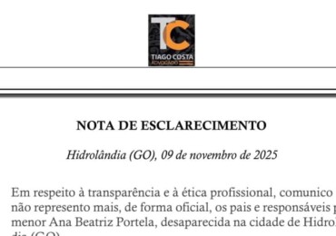 Hidrolândia (GO) — O advogado Tiago César Costa divulgou neste sábado (9/11) uma nota de esclarecimento informando que não representa mais, de...