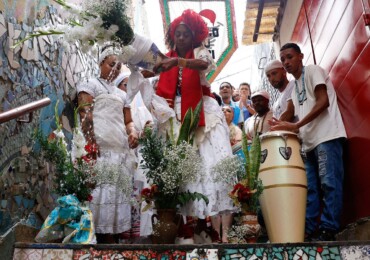 Baianas lavam escadaria em Copacabana em homenagem a Oxóssi