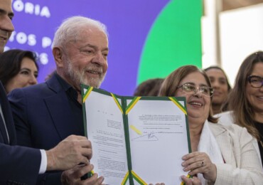 Na base aérea de Brasília, presidente Lula sancionou a lei que trata do tem, além de outra que garante, no programa Bolsa Atleta, a manutenção do pagamento da bolsa à atleta gestante ou puérpera.